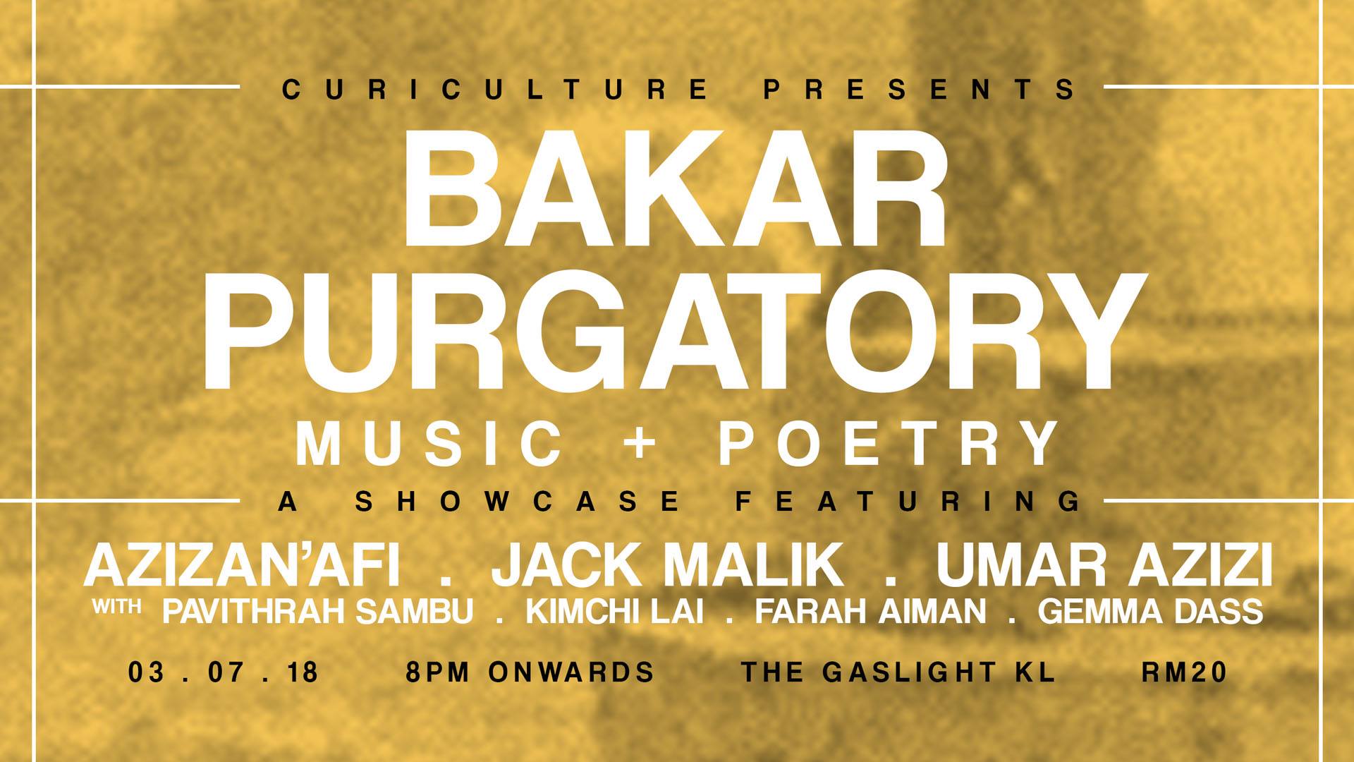 Bakar Purgatory is a experimental effort by Jack Malik, Azizan'Afi and Umar Azizi to explore performance art through music, theater-esque sensibilities, spoken word poetry and combining all of them into an experience. Taking influence from jazz, Malaysiana, the Avant-garde movement and beat poetry, they look into touching the theme of identity, existentialism, belonging and also love by stripping away the technicality and tapping into the more expressive side of the art.