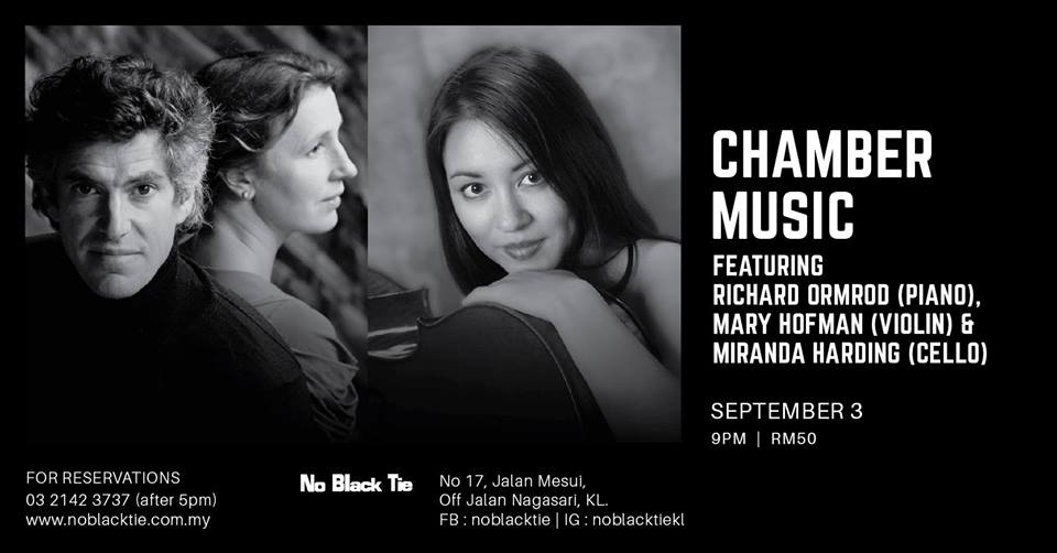 International musicians Richard Ormrod (piano), Mary Hofman (violin) and Miranda Harding (cello) have toured all over the world performing extensively at major venues and festivals as soloists and chamber musicians. The recital at No Black Tie will feature a specially selected programme of duo and trio music by Beethoven, Schumann, Janacek and Dvorak.
