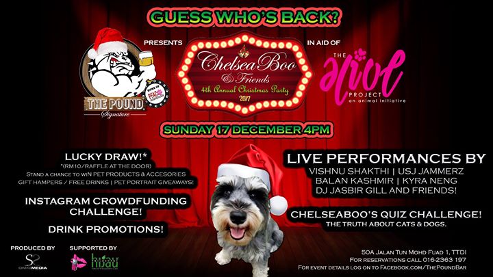 ChelseaBoo’s musically talented buddies Vishnu Shakthi, USJ Jammerz, Balan Kashmir, Kyra Neng and friends will be howling and meowing alongside her and her canine companions, and when DJ Jasbir Gill takes to the decks for the rest of the night, we can truly say “the world has gone to the dogs!”