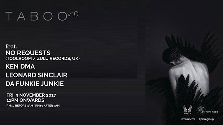 In terms of music , the complexity of such line up will lure you into niche genres and surprising performances . From funky grooves to garage to basslines to breaks to house of the rarest variety to liquid, this edition has it all and it features our regulars No Requests (Toolroom Records, Zulu, UK). Ken DMA (UK) with a more leftfield approach and 2 KL music pioneers : Da Funkie Junkie , joining us for the very first time and Leonard Sinclair, returning to the box- this time at Taboo, after a long absence caused by gigging nearly everyday for the past year.