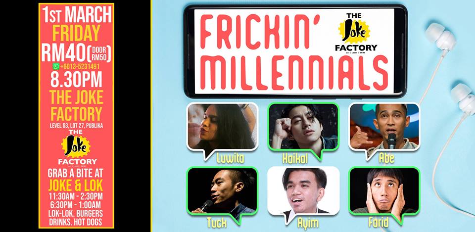 What’s the deal with their skinny jeans, avocado toast, and air pods? We’ve all heard about how weird these millenials can be, but now it’s time to hear them speak for themselves! The Joke Factory, Publika presents FRICKIN' MILLENNIALS! Tickets are on sale now. Call +60135231491, WhatsApp us at: http://thejokefactory.wasap.my/ or click here: https://bit.ly/2RvYCnr , for bookings! Ticket price is RM40 (online booking) or RM50 (walk-in).