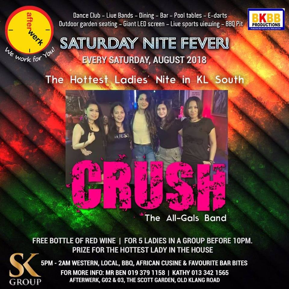 The All-Gals Crush Band, featuring Gracie from Sabah, Pat & Nancy of Candy band Sarawak fame, Kim Herrin on drums and lead guitarist, Khalisa. From 9.00PM.