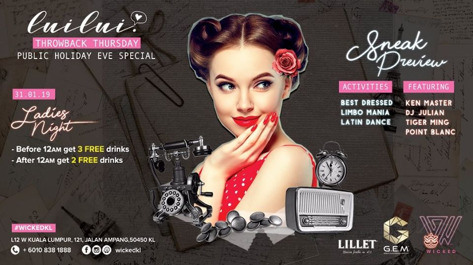 Throwin' it back to the good ol' days spinning PURE RETRO BEATS! Featuring DJ Ken Masterk, Julian Fernandez, Tiger Ming & hyped by MC Point Blanc! Wear your A-game to WIN Best Dressed! X Limbo-mania X Latin Dancers. RSVP early at +6010 838 1888. LADIES it's your night to party!!! Limited free flow cocktails from 10pm onwards.