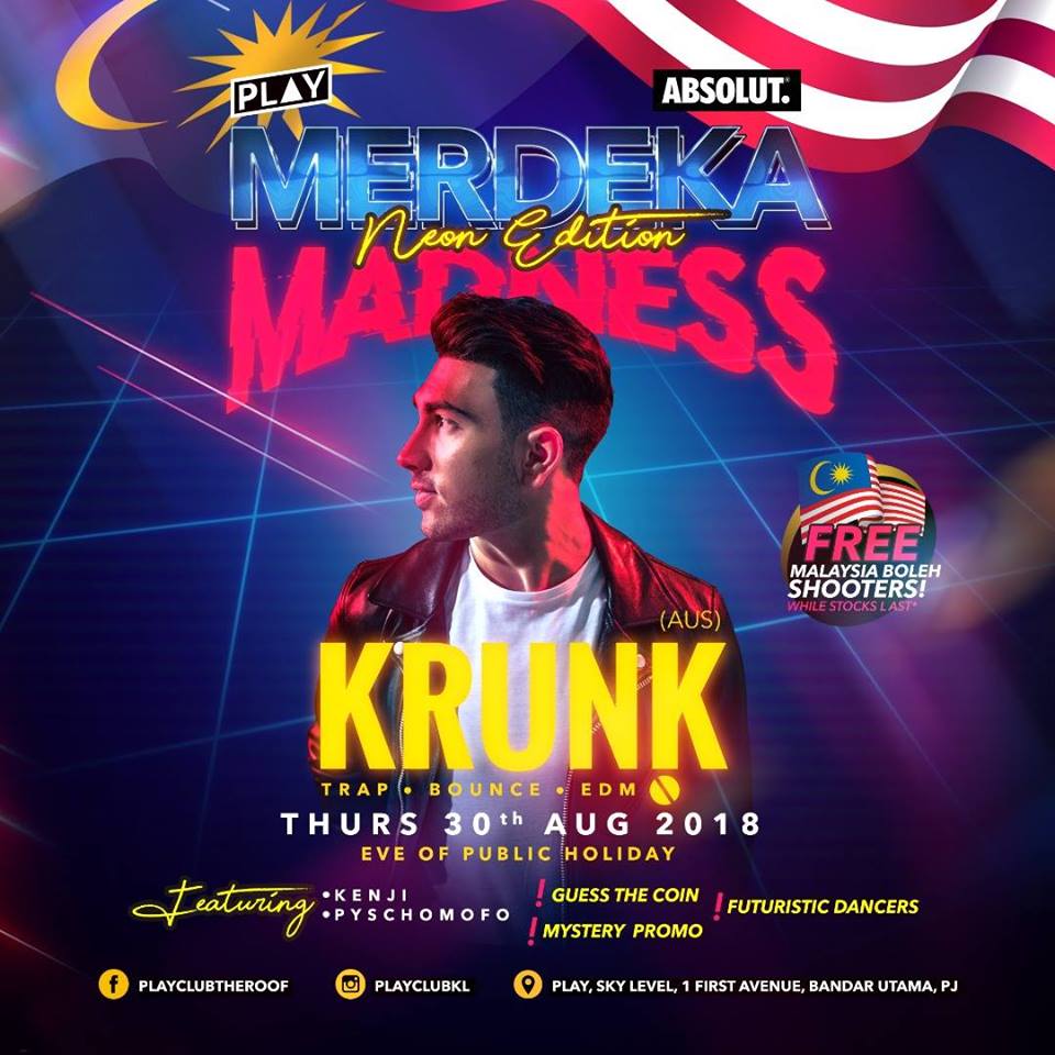 Mark ur calendar for Thurs, 30th Aug as we're gonna party like there's no work tomorrow! Merdeka Madness - NEON Edition ft Krunk (AUS) with his signature bounce, trap & EDM beats, supported by Kenji & Psychomofo. Don't miss this night -