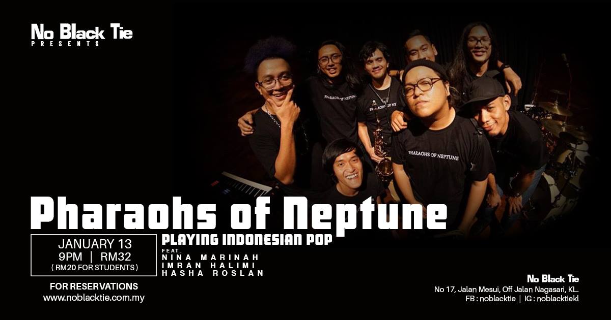 A Jazz-like band based in Kuala Lumpur, Pharaohs of Neptune will be performing again at No Black Tie, this time playing Indonesian Pop with special guest Nina Marinah, Imran Halimi & Hasha Roslan!
