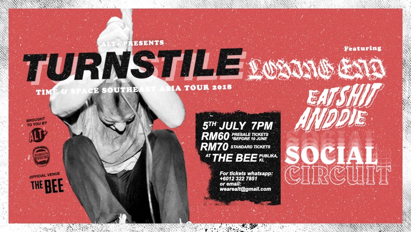 After surprising our shore 2 years ago with a 2 song set, TURNSTILE is back for their first SEA Tour. Promoting their new release "Time & Space", they will be performing at The Bee with local acts Social Circuit, Eat Shit And Die and Singapore's Losing End. Get your tickets now, and see you on 5th July.