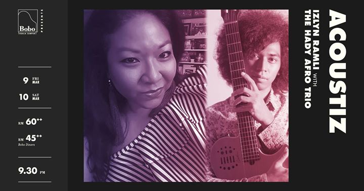 Izlyn Ramli takes to the stage with her infectious joie de vivre for an evening of songs from the sound track of her life supported by Tarakucha band mates; finger style guitarist Hady Afro, bassist Amar Azalan and Bobo regular AKZ on percussion —the Hady Afro Trio!